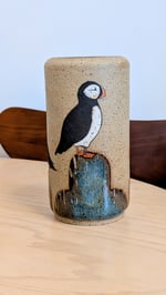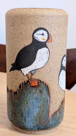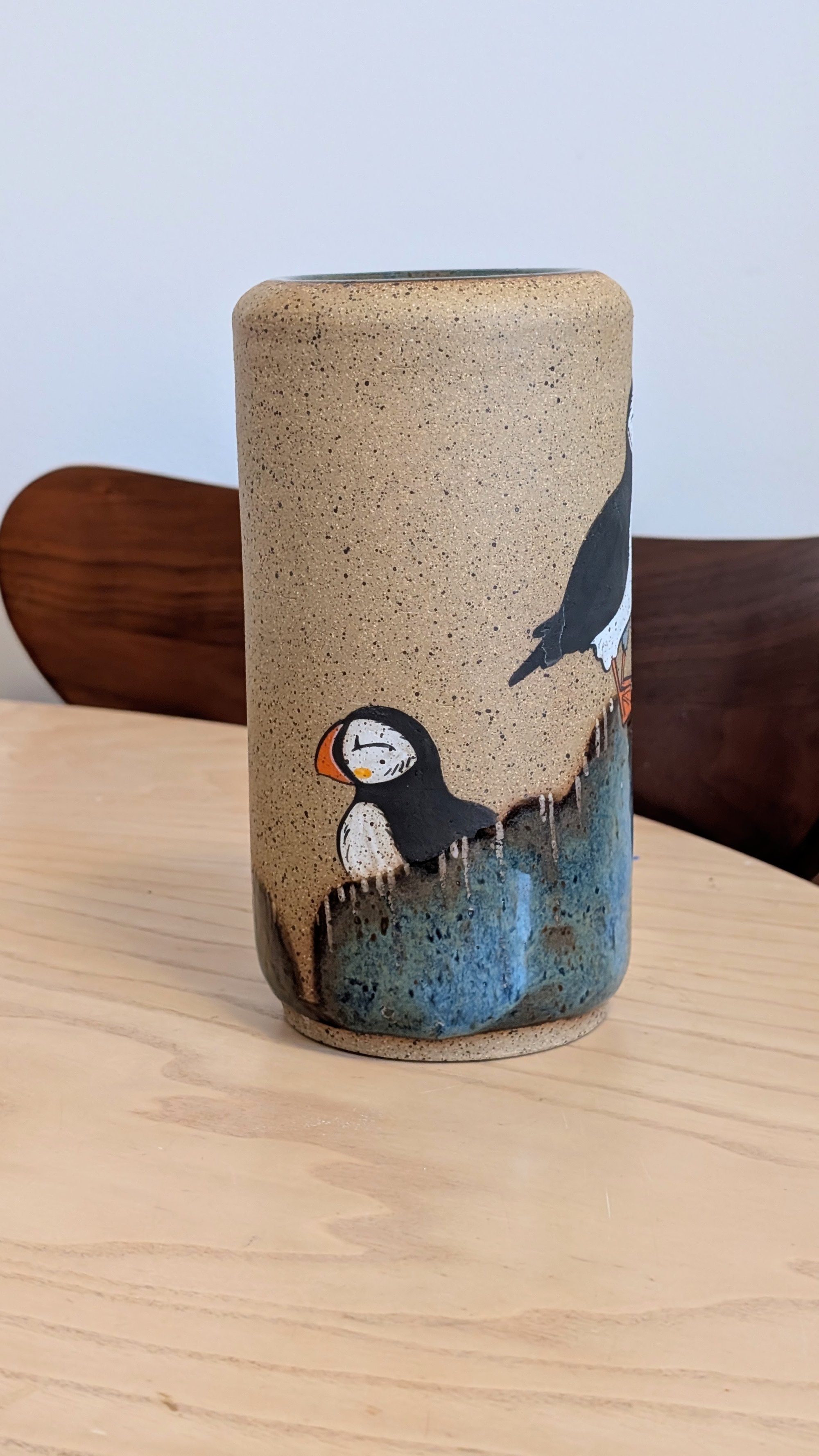A vase with 4 puffins. Fully Glazed on the inside and partially glazed rocks on the outside,